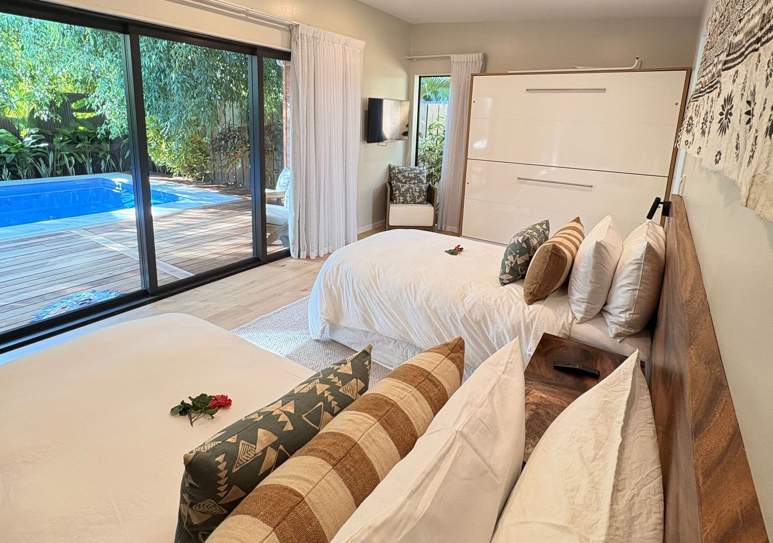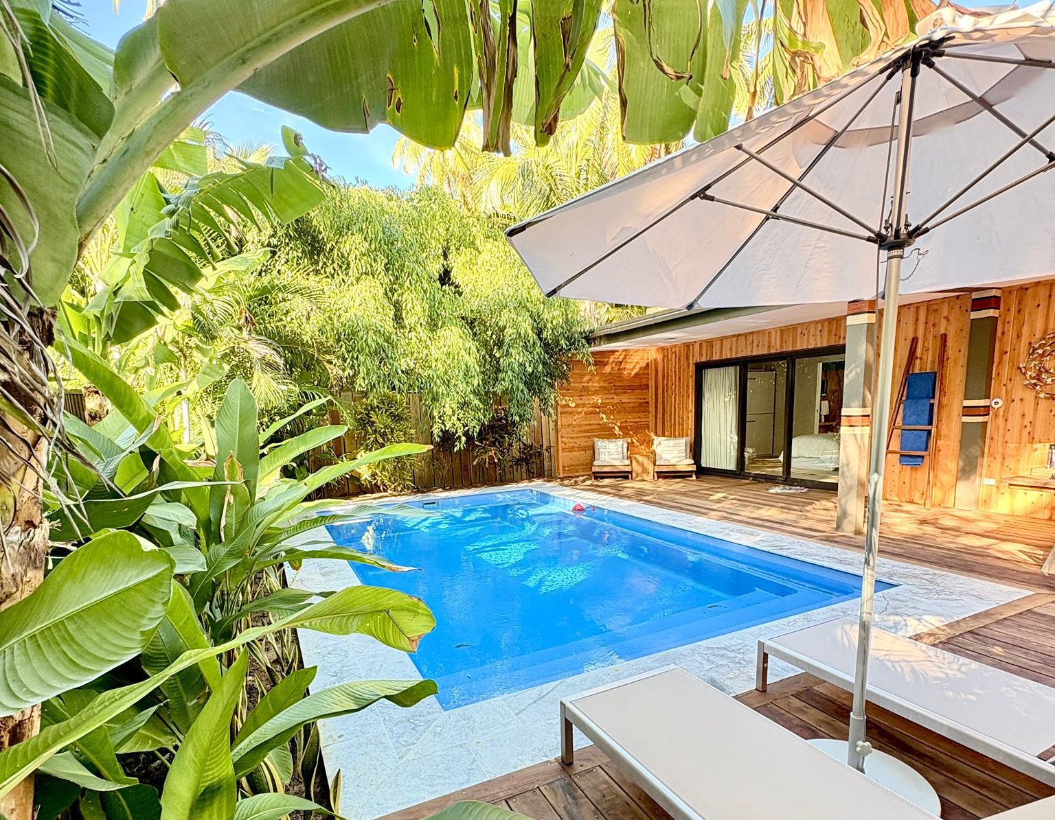 The two bedroom garden home with a 7 meter private pool is set in a secluded garden oasis, positioned to allow gentle sea breezes, and easy access to the ocean.